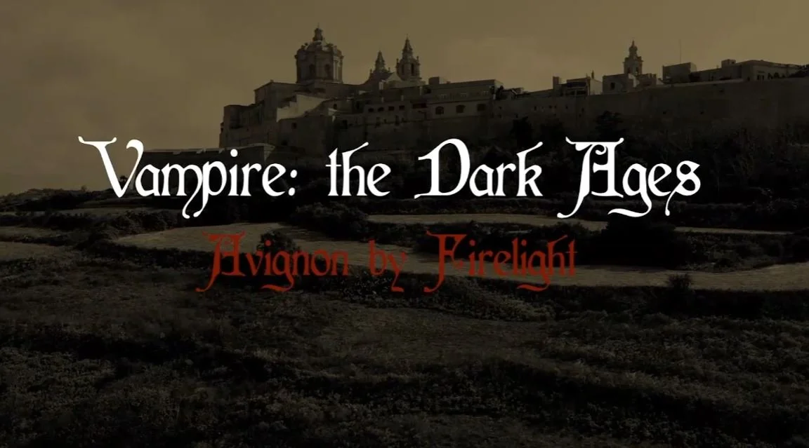 Yellowed landscape of Avignon with Calligraphic text ‘Vampire: the Dark Ages’ ‘Avignon by Firelight’