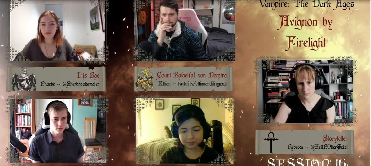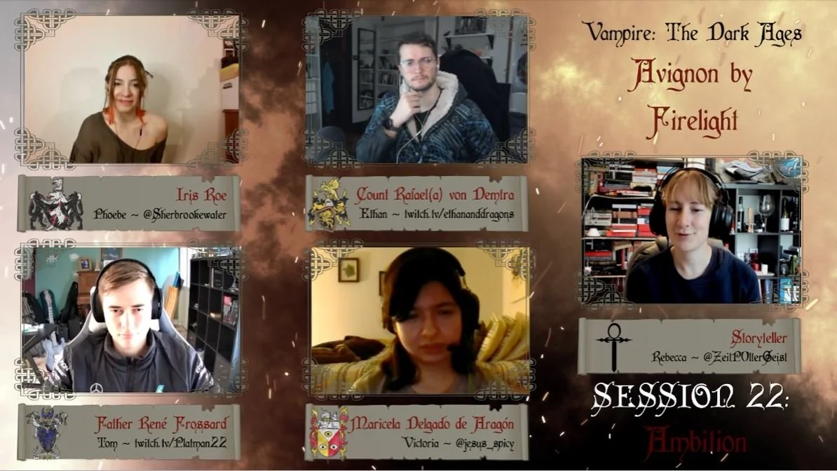 A Dark Ages Vampire the Masquerade 5th Edition Game created and run by Rebecca A.K. @ZeitP0lterGeist on twitch.tv/Zeit_Poltergeist . It is set in 1388 Avignon France during a time of religious tension between France and Italy. The episodes are not recorded mimicing a home game.